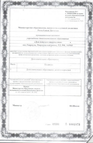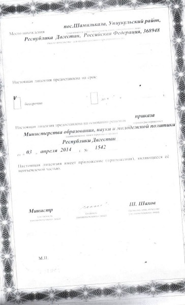 | Адрес местонахождения образовательной организации* | 368950, Унцукульский район, пгт.Шамилькала, ул Махача Дахадаева оффис №7 |